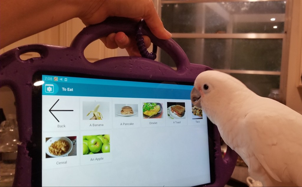 Three cockatoos live with me in my home. One of them, in particular, Ellie (a Goffin’s cockatoo), had a lot of behaviour challenges such as screaming, biting, and chasing the other birds, seemingly due to her intelligence and lack of mentally stimulating activities. A few years ago, I began teaching her concept-training tasks, such as discriminating letters, shapes, and other everyday objects/activity vocabulary to mentally challenge her. Her behaviour improved quite a bit, and she seemed so much calmer. The tablet seemed full of possibilities for learning, games, puzzles – and eventually, we discovered the CommBoard, too. The CommBoard is an Augmentative Alternative Communication device developed for nonverbal humans, but we adapted the pictures and menu items to objects and activities within the birds’ daily experiences. It’s been so neat to watch them not only learn how to use it for communication – but own the communication too. They ring a bell to ask to use it and then request food/beverage items (like apples or a bowl of water), activities such as tablet app games, and even use it to ask to interact with other people’s household members.